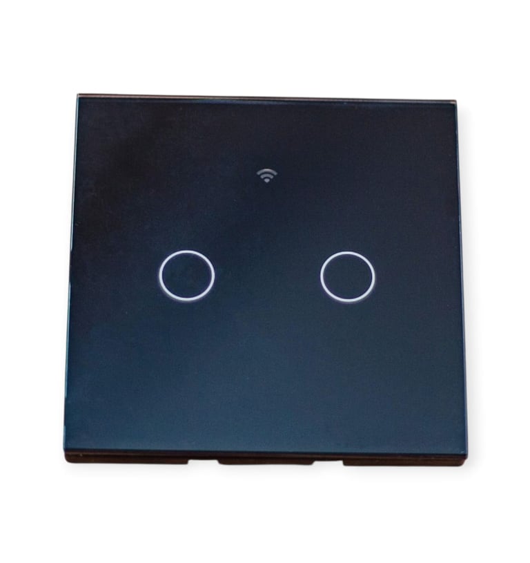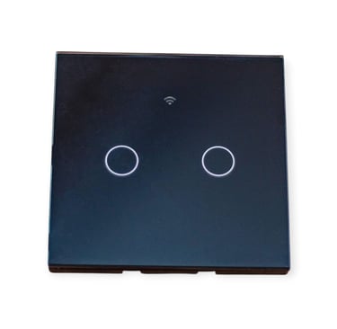A dual-control smart switch designed for managing two lighting points or appliances remotely. Supports app control and smart automation
